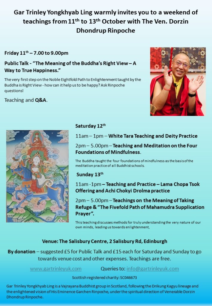 The Venerable Dorzin Dhondrup Rinpoche visited Scotland from the 11th to 14th October 2024! Here is the programme of events that we enjoyed – teachings and pujas.
